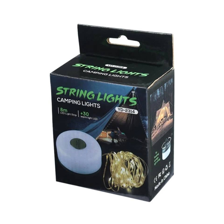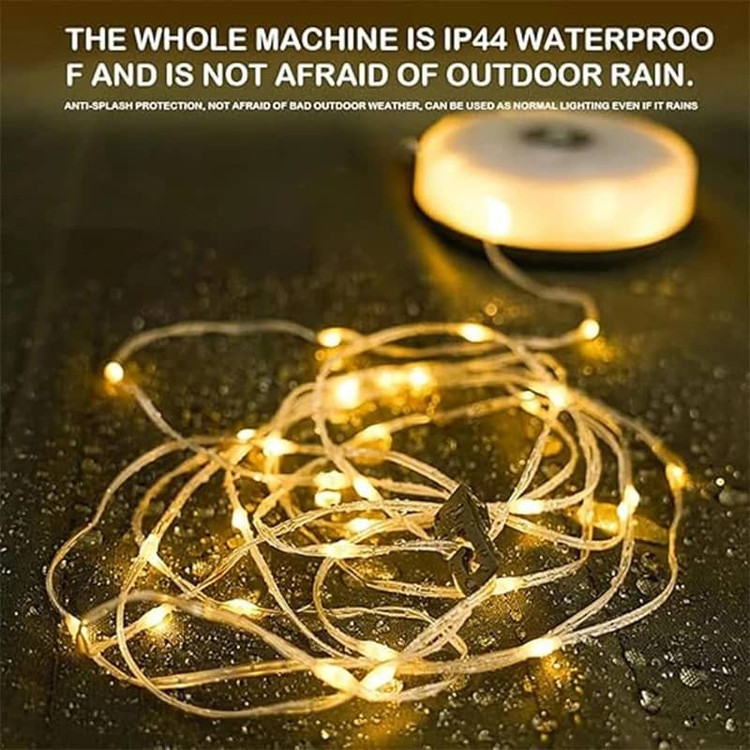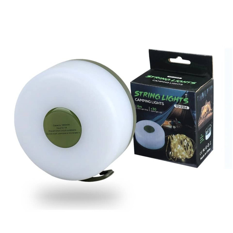 این محصول ترکیب جالبی از ریسه ۸ متری + چراغ گرد مرکزی با باتری داخلیه و همین باعث میشه هم برای روشن کردن فضای داخلی چادر مناسب باشه و هم برای تزیین محیط اطراف.