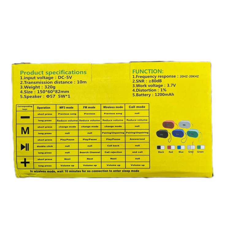 با باتری 1200mAh میتواند برای چند ساعت پخش مداوم دوام بیاورد؛ معمولاً ۲ تا ۴ ساعت بسته به نوع صدا و بلندی ولوم. شارژ آن از طریق درگاه DC 5V انجام میشود و کابل معمولاً داخل بسته است.