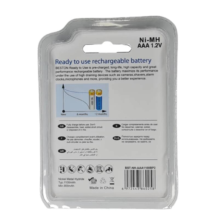 باتری نیمقلمی شارژی Beston AAA 1100mAh از نوع Ni‑MH (نیکل متال هیدرید) بوده و گزینهای مطمئن و اقتصادی برای جایگزینی باتریهای یکبار مصرف محسوب میشود. این باتری با ولتاژ 1.2 ولت و ظرفیت واقعی 1100 میلیآمپر ساعت، توانایی تأمین انرژی پایدار و طولانیمدت را برای انواع دستگاههای دیجیتال فراهم میکند.
